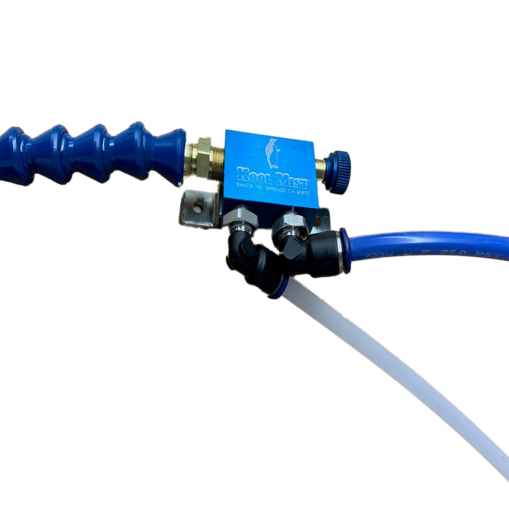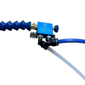 The Mist Coolant System works with a siphon delivery system. It contains a 7” flexible plastic nozzle, sight gauge and independent air and coolant controls for a variable spray delivery. Additionally, compressed air and 110 volt power are required for use .